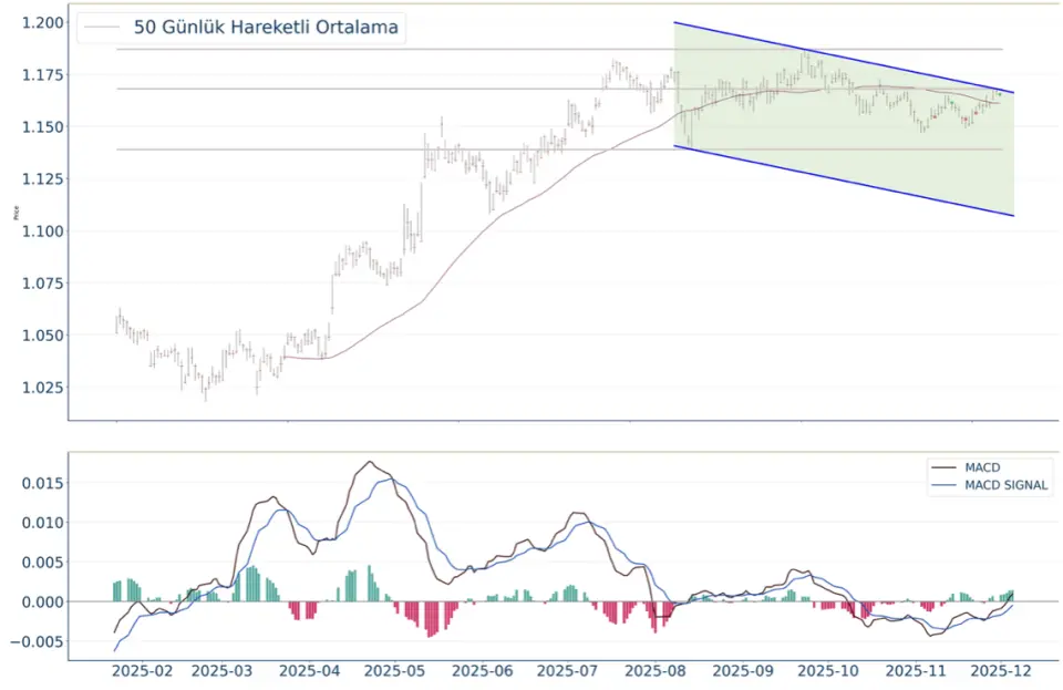 EUR/USD, geçtiğimiz günü %0.1 düşüş ile kapattıktan sonra, 20 günlük hareketli ortalaması olan 1,159 seviyesinin üzerinde fiyatlanıyor. Bu durum EUR/USD için aylık periyotta pozitif bir görüntü çiziyor. Son günde yapılan işlemlerde ise en yüksek 1,166 seviyesinde işlem gördükten sonra günü 1,166 seviyesinde tamamladı. Öte yandan, trend göstergelerinden biri olan MACD al pozisyonunda, pozitif bölgede hareket ediyor. 1,189-1,194 dirençler, 1,157-1,141 destekler olarak değerlendirilebilir.