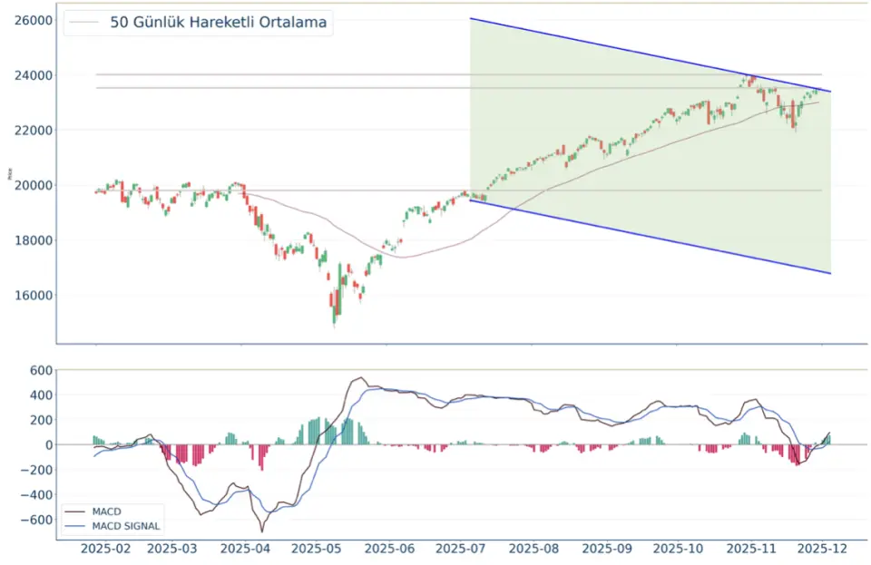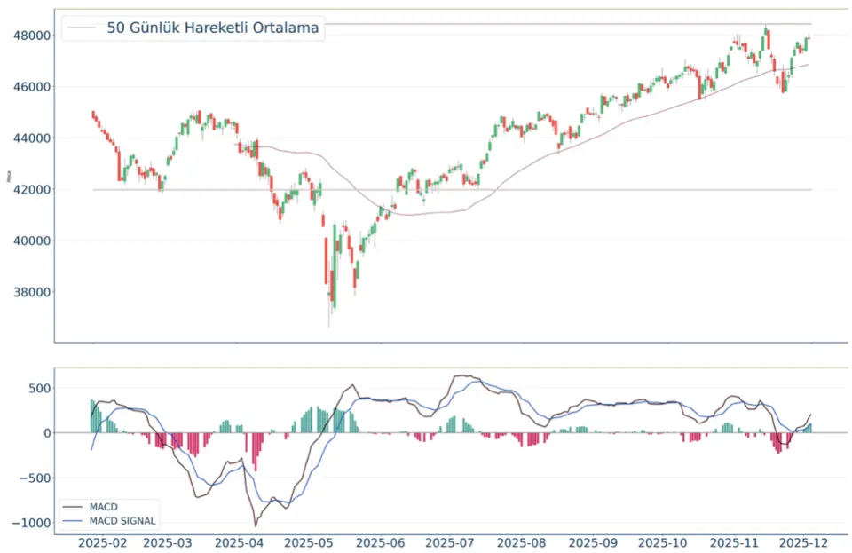 Dow Jones Endeksi kapanışla birlikte %0.07 düşüş gerçekleştirdi. Güne 47.888 seviyesinde başladı ve gün içinde en yüksek 48.049, en düşük 47.692 seviyesinden işlem gördü. Kapanışı ise 47.850 seviyesinde tamamladı. Son kapanış 5 günlük hareketli ortalamanın üzerinde gerçekleşti. MACD çizgisi sinyal çizgisinin üzerinde, pozitif bölgede yer alıyor. Yükseliş halinde ilk direnç olarak 48.899 seviyesi takip edilirken bu direncin de geçilmesi halinde 49.184 takip edilebilir. Negatif hareketlerde ise destekler 47.486 ve 46.722 olarak izlenebilir.