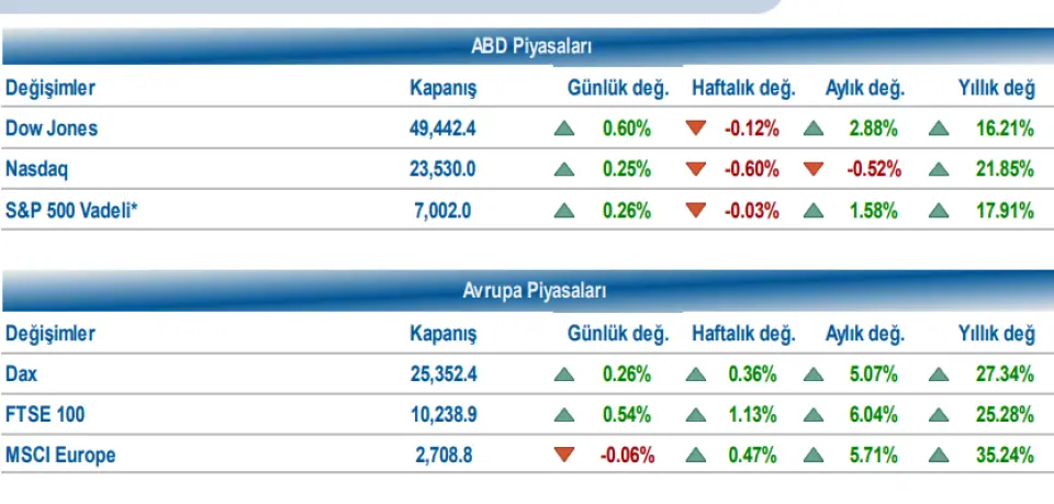 Dow Jones %0,60 yükselişle 49.442,44, S&P 500 endeksi %0,26 yükselişle 6.944,47 ve Nasdaq %0,25 yükselişle 23.530,02 seviyesinden günü tamamladı. Avrupa piyasalarında karışık seyir izlendi. DAX endeksi %0,26, Euro Stoxx 50 endeksi %0,60, FTSE 100 endeksi %0,54 ile alıcılı seyir izlerken, CAC 40 endeksi %0,21 satıcılı seyir izledi.