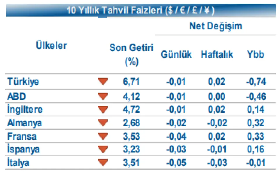 Küresel piyasalarda, veri akışının zayıf olduğu günde tahvil piyasaları sınırlı alıcılı seyir izledi. Gün içinde ABD 10 yıllık gösterge tahvil faizi 1 bp azalışla 4,12, Almanya 10 yıllık gösterge tahvil faizi 2 bp azalışla %2,68 seviyesinde işlem gördü.