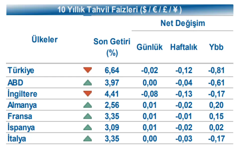 Halk Yatırım yayınladığı tarihli 23 Ekim günlük bültende tahvil ve döviz piyasalarındaki gelişmelere yer verdi. Aracı kurumun analizi şu şekilde:Küresel piyasalarda, veri akışının zayıf olduğu günde tahvil piyasalarında yatay seyir izlendi. Gün içinde ABD 10 yıllık gösterge tahvil faizi %3,97, Almanya 10 yıllık gösterge tahvil faizi %2,56 seviyesinde işlem gördü.
