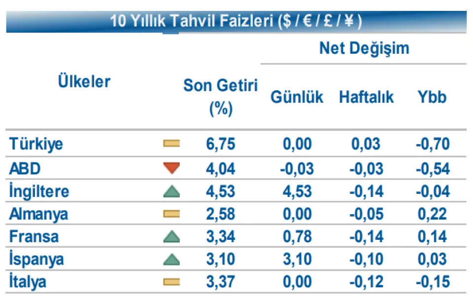 Yurt içi tarafta, 2026 yılı Merkezi Yönetim Bütçe Kanunu Teklifi Basın Bilgilendirme toplantısı takip edildi. 2026 yılı için bütçe açığının Gayrisafi yurtiçi hasılaya oranının %3,5 olarak öngörüldüğü açıklandı. TL tahvil piyasalarında orta ve uzun vadelerde sınırlı satıcılı seyir izlendi. 2 yıllık gösterge tahvilin bileşik faizi 10 bp azalışla %40,60, 10 yıllık gösterge tahvilin faizi 8 bp artışla %32 seviyesinden işlem gördü.