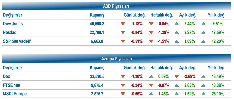 Bu gelişmelerle ABD endekslerinde satıcılı seyir izlendi. Dow Jones endeksi %1,18 kayıpla 46.590,24, S&P 500 endeksi %0,92 kayıpla 6.672,41, Nasdaq endeksi %0,84 düşüşle 22.708,08 puandan günü tamamladı.