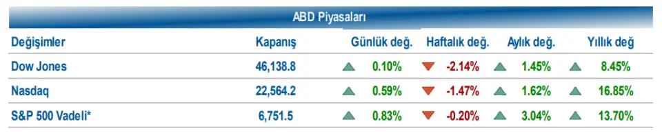Bu gelişmelerin etkisinde, ABD endekslerinde alıcılı seyir izlendi. Dow Jones endeksi %0,10 artışla 46.138,77, S&P 500 endeksi %0,38 yükselişle 6.642,16, Nasdaq endeksi %0,59 artışla 22.564,23 puandan günü tamamladı. ABD’de tahvil faizleri cephesinde 2 yıllık tahvil faizi %3,60 seviyesine, 10 yıllık tahvil faizi de %4,14 seviyesine hafif yükseldi.