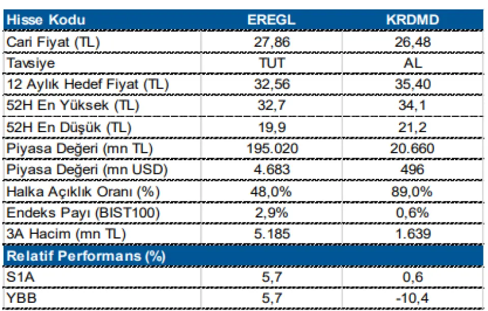 Halk Yatırım dünyada ve Türkiye' de demir çelik sektörünü mercek altına aldı. Büyük bir araştırma raporu hazırlayan Halk Yatırım sonuçta, borsamızın demir çelik dev Ereğli Demir Çelik EREGL ve Karabük Demir Çelik KRDMD hisselerinin finansal verilerine ve dünyadaki konjonktüre dayanarak fiyat durumunu analiz etti.