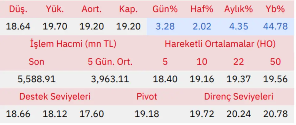 Gün içinde en düşük 18.64 en yüksek 19.70 seviyesini gören Emlak Konut Gayrimenkul Yatırım Ortaklığı hissesinin günü %3.28 kazançla tamamladığı gözlenmektedir. Pivot seviye 19.18 seviyesinden geçmekte olup, aşağı yönlü hareketlerde birinci destek 18.66, ikinci destek ise 18.12 seviyesinden geçmektedir. Dirençler ise sırasıyla 19.72, 20.24 seviyelerinden geçmektedir. Bu aşamada endeksin 5 günlük HO seviyesinin %4.36 üstünde, 22 günlük HO seviyesinin ise %0.86 altında hareket ettiği dikkat çekmektedir. Son gün işlem hacmi ise bu aşamada 5 günlük ortalama işlem hacminin % 41.02 üstünde gerçekleşmiştir.