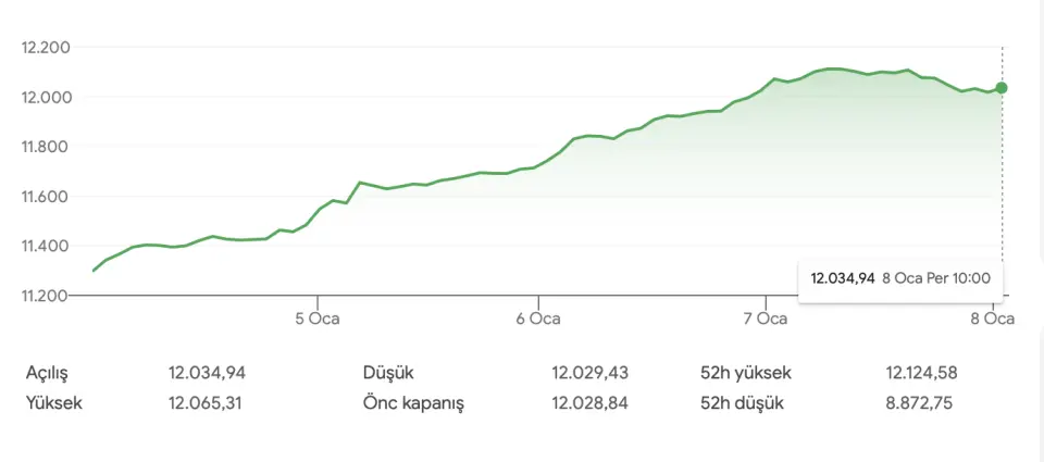 Yeni güne Borsa İstanbul'da BIST 100 endeksi, yüzde 0,05 artışla 12.034,94 puandan başlangıç yaptı. Önceki gün alış ağırlıklı bir seyrin hakim olduğu Borsa İstanbul'da BIST 100 endeksi, günü yüzde 0,04 artış ile 12.028,84 puandan noktalayarak tüm zamanların en yüksek günlük kapanışını yaptı.