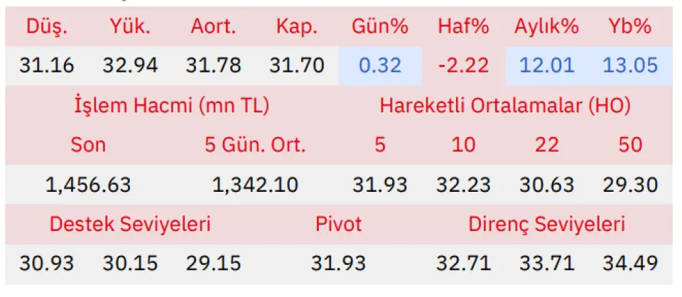 Gün içinde en düşük 31.16 en yüksek 32.94 seviyesini gören CW Enerji Mühendislik hissesinin günü %0.32 kazançla tamamladığı gözlenmektedir. Pivot seviye 31.93 seviyesinden geçmekte olup, aşağı yönlü hareketlerde birinci destek 30.93, ikinci destek ise 30.15 seviyesinden geçmektedir. Dirençler ise sırasıyla 32.71, 33.71 seviyelerinden geçmektedir. Bu aşamada endeksin 5 günlük HO seviyesinin %0.73 altında, 22 günlük HO seviyesinin ise %3.50 üstünde hareket ettiği dikkat çekmektedir. Son gün işlem hacmi ise bu aşamada 5 günlük ortalama işlem hacminin % 8.53 üstünde gerçekleşmiştir.