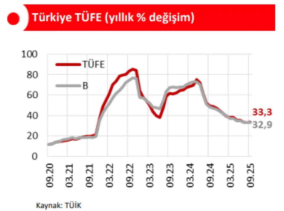 Tüketici enflasyonu eylülde aylık %3,23 artarken, yıllık artış 0,3 puan artışla %33,3’e yükseldi ve ilk kez TCMB tahmin bandı üst sınırının üzerine çıktı (≈1 puan). Eylül ayında eğitim, gıda ve ulaştırma fiyatlarında yüksek artışlar gözlendi. Enflasyon eğilimi önceki aya göre yükselirken, mayıs sonrasındaki istikrarlı bozulma dikkat çekti. TCMB iletişiminde öne çıkarılan dağılım bazlı eğilim göstergelerinden medyan ve budanmış enflasyon oranları sırasıyla %2,1 ve %2,0 seviyesinde oluştu (önceki %2,0 ve %1,9). %27-28 civarında katılık gösteren yıllıklandırılmış enflasyon eğilimi, yıl sonunda enflasyonun TCMB tahmin bandı içerisinde kalma olasılığının zorlaştığına işaret ediyor. Alt kalemler incelendiğinde, büyük ölçüde döviz kuru etkisini yansıtan temel mallar dışında büyük bir iyileşme görülmedi. Ekimde enflasyonun aylık %2,8, yıllık %33,2 artacağını tahmin ediyoruz.