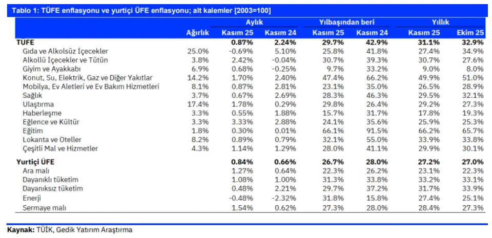 Gedik Yatırım Kasım ayı TÜFE istatistiklerine dair raporunu yyaınladı. Aracı kurumun analizleri aşağıdaki gibi oldu: