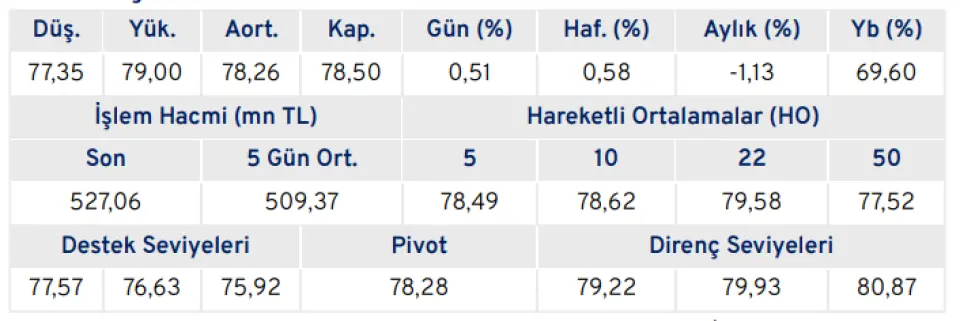 Gün içinde en düşük 77,35 en yüksek 79,00 seviyesini gören Enka İnşaat hissesinin günü %0,51 kazançla tamamladığı gözlenmektedir. Pivot seviye 78,28 seviyesinden geçmekte olup, aşağı yönlü hareketlerde birinci destek 77,57, ikinci destek ise 76,63 seviyesinden geçmektedir. Dirençler ise sırasıyla 79,22, 79,93 seviyelerinden geçmektedir. Bu aşamada 5 günlük HO seviyesinin %0,01 üzerinde, Son gün işlem hacmi ise bu aşamada 5 günlük ortalama işlem hacminin % 3,47 üzerinde gerçekleşmiştir.