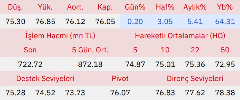 Gün içinde en düşük 75.30 en yüksek 76.85 seviyesini gören Enka İnşaat ve Sanayi hissesinin günü %0.20 kazançla tamamladığı gözlenmektedir. Pivot seviye 76.07 seviyesinden geçmekte olup, aşağı yönlü hareketlerde birinci destek 75.28, ikinci destek ise 74.52 seviyesinden geçmektedir. Dirençler ise sırasıyla 76.83, 77.62 seviyelerinden geçmektedir. Bu aşamada endeksin 5 günlük HO seviyesinin %1.58 üstünde, 22 günlük HO seviyesinin ise %0.92 üstünde hareket ettiği dikkat çekmektedir. Son gün işlem hacmi ise bu aşamada 5 günlük ortalama işlem hacminin % 17.14 altında gerçekleşmiştir.
