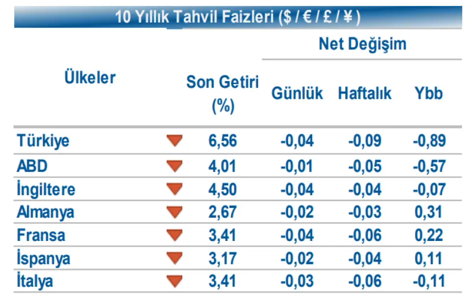 Veriler sonrası tahvil piyasaları sınırlı alıcılı seyir izledi. Gün içinde ABD 10 yıllık gösterge tahvil faizi 1 bp azalışla %4,01, Almanya 10 yıllık gösterge tahvil faizi 2 bp azalışla %2,67 seviyesinde işlem gördü.