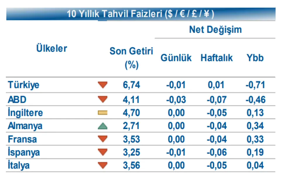 Türkiye’nin 5 yıllık Dolar cinsi CDS risk primi yatay hareketle 257 bp’dan işlem görürken, Ocak 2035 vadeli 10 yıllık Eurobond faizi 1 bp azalışla %6,74 seviyesine geriledi. Döviz tarafında, majör para birimleri ABD Dolar’ı karşısında değer kazandı. Dolar Endeksi 97,721 seviyesine gerilerken, Euro / Dolar paritesi 1,1737 seviyesine yükseldi. Dolar / TL spot kuru ise 41,58 seviyesinde işlem gördü. Yurt içi tarafta TL tahvil piyasaları alıcılı seyir izledi. Temmuz 2027 vadeli 2 yıllık gösterge tahvilin bileşik faizi 33 bp azalışla %39,52, 10 yıllık gösterge tahvilin faizi ise 29 bp azalışla %31,39 seviyesinden işlem gördü.