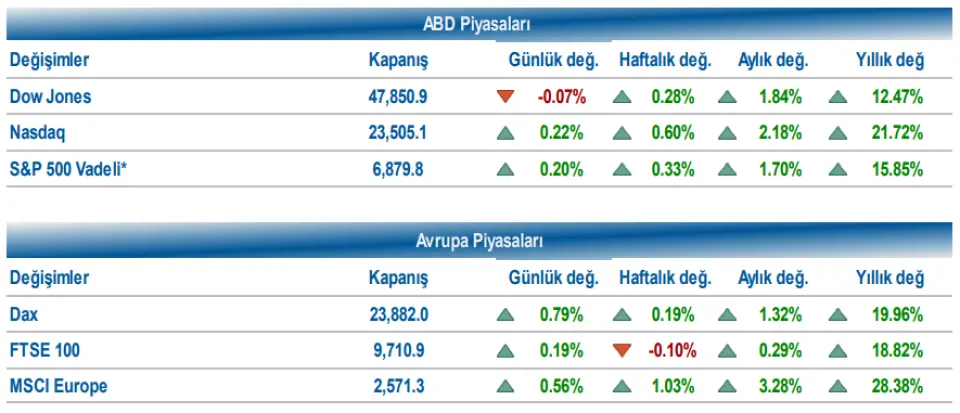 Bu güçlü metrikler sonrası şirket yıl sonu satış görünümünü yukarı revize ederek beklentilerini güçlendirdi. Dow Jones endeksi %0,07 azalışla 47,850.94 seviyesinden kapanırken, S&P 500 endeksi %0,11 değer artışıyla 6.857,12 seviyesinden, Nasdaq endeksi de %0,22 yükselerek, 23.505,14 puandan günü tamamladı.