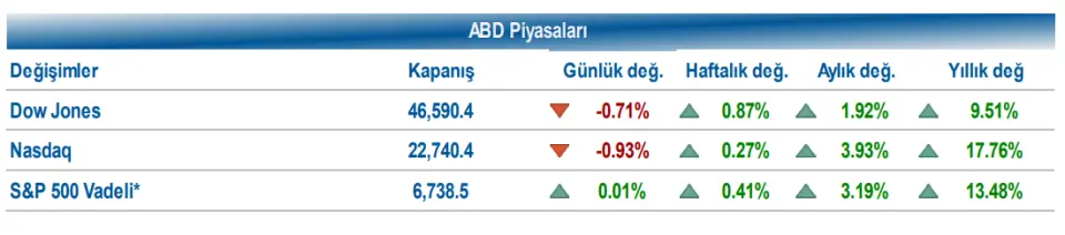 Dow Jones endeksi %0,71 düşüşle 46.590,41 seviyesine gerilerken, S&P 500 endeksi %0,53 değer kaybıyla 6.699,40 seviyesinden kapandı. Nasdaq endeksi de %0,93 düşüşle 22.740,40 puandan günü tamamladı.