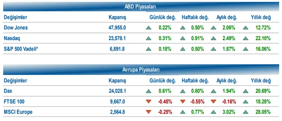 Öte yandan, VIX endeksi ise 15,78’ten 15,41 seviyesine geriledi. Dow Jones endeksi %0,22 puan artışla 47,954.99, S&P 500 endeksi %0,19 puan değer artışıyla 6.870,40, Nasdaq endeksi de %0,31 puan yükselişle 23.578,13 puandan günü tamamladı. Avrupa hisse senedi piyasalarında karışık bir görünüm hakimdi. Almanya DAX endeksi ve İngiltere FTSE 100 endeksi hafif gerilerken; Euro Stoxx 50 endeksi sınırlı bir yükselişle günü tamamladı.