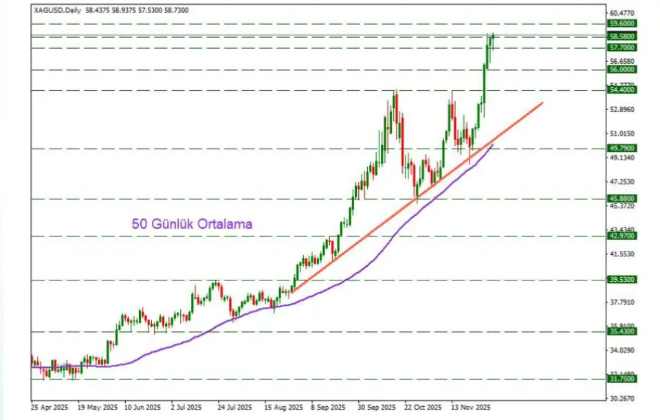 Ons gümüş güçlü yükseliş serisinin sekizinci gününde 58.93 seviyesinde rekor tazeledikten sonra 58.58 direncini test etmeye devam ediyor. Günlük kapanışın bu direnç üzerinde gerçekleşmesi durumunda 59.60 bölgesi bir sonraki direnç olarak takip edilebilir. Olası kar satışlarında 57.70 bölgesi destek oluşturabilir.