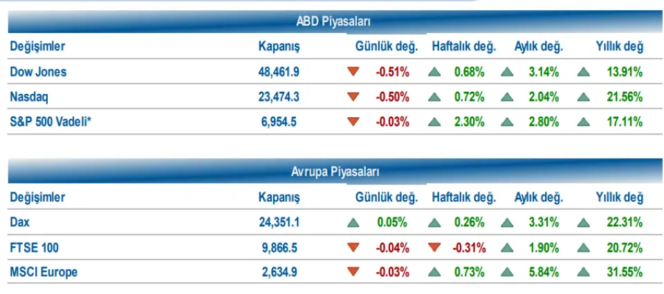 Dow Jones endeksi %0,51 düşüşle 48.461,93 seviyesine gerilerken, S&P 500 endeksi de %0,35 değer kaybıyla 6.905,74 seviyesinden kapandı. Nasdaq endeksi %0,50 düşüşle 23.474,35 puandan günü tamamladı.