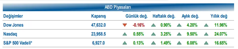Tüm bu gelişmeler doğrultusunda ABD piyasaları karışık seyir izledi. Dow Jones endeksi %0,16 azalışla 47.632 seviyesine yükselirken, S&P 500 endeksi günü 6.890,6 ile yatay seviyeden kapadı. Nasdaq endeksi ise %0,55 yükselişle 23,958,47 puandan günü tamamladı.