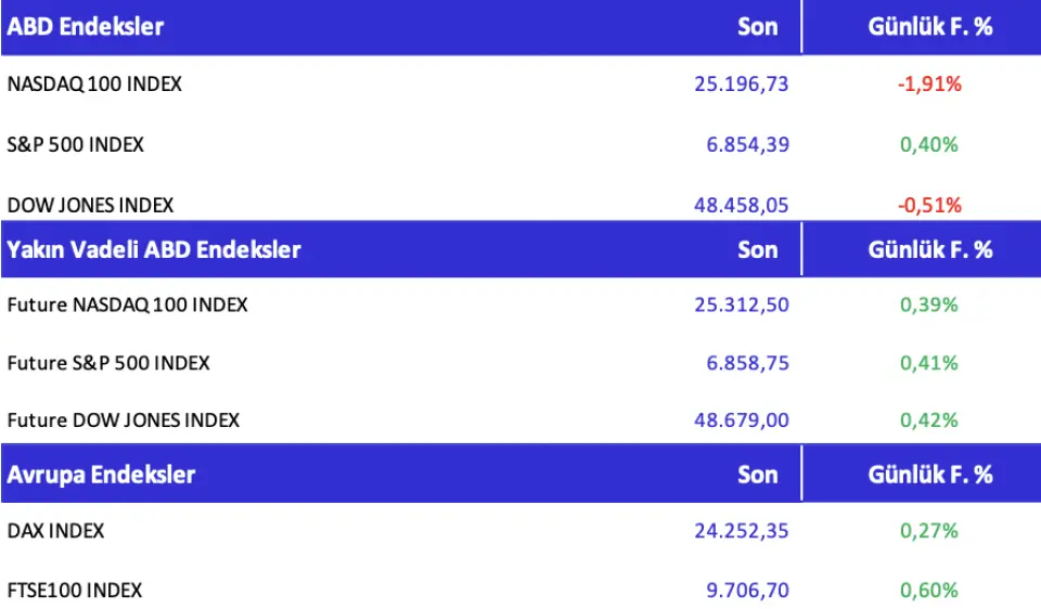 Fed’in yarattığı iyimserlik geçen hafta beklentileri karşılamayan bilançoların yarattığı satışlarla gölgelenirken, yeni haftanın ilk işlemleri piyasaların bu karamsarlığı geride bırakmaya çalıştığını gösteriyor. Wall Street’te özellikle yapay zeka hisselerinde yoğunlaşan kar satışları öne çıkarken, Broadcom’un zayıf satış tahmini ve Oracle’ın artan harcamalar ile geciken veri merkezi projeleri sektörü baskıladı. Nasdaq 100 ve S&P 500 gerilerken, Dow Jones ve Russell 2000 rekor seviyelerden çekildi. Endekslerdeki düşüş, zirveler sonrası doğal bir kar realizasyonu olarak değerlendiriliyor. Yeni günde vadeli endeksler toparlanma sinyali verirken, Fed yetkililerinin farklı faiz mesajları gelecek yıl daha agresif parasal gevşeme beklentilerini sınırlıyor.