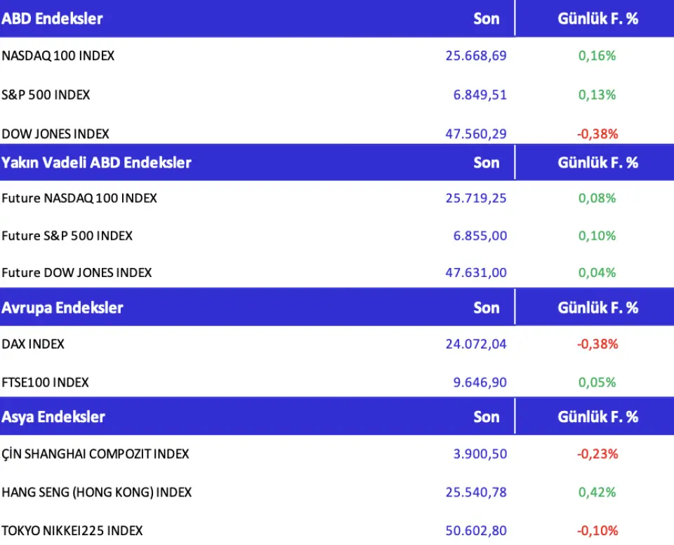 Sağlık sektörü, Merck’in RSV aşılarına yönelik FDA incelemesi ve Eli Lilly’nin dokuz gündür süren değer kaybı nedeniyle baskı altında kaldı; buna karşılık CVS güçlü kâr görünümüyle yükseldi. Sanayi, bankacılık ve emlakta satışlar etkili olurken finansal hizmetler tarafında KKR, Blackstone ve Apollo güçlü performans gösterdi. Enerji hisseleri Exxon ve Targa Resources öncülüğünde değer kazanırken, teknoloji tarafında Broadcom, Micron ve Lam Research pozitif ayrıştı. Meta ve bazı telekom hisseleri düşerken, perakende sektöründe AutoZone zayıf sonuçlarla geriledi; Amazon ve Ulta Beauty ise yükseldi.