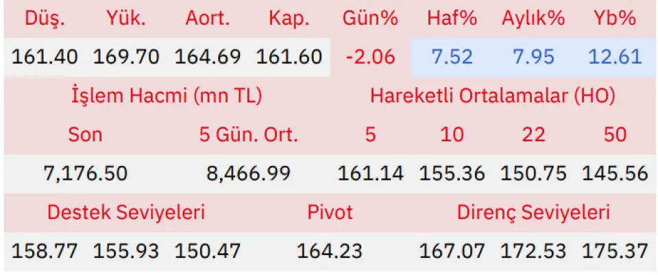 Gün içinde en düşük 161.40 en yüksek 169.70 seviyesini gören Türkiye Garanti Bankası hissesinin günü %2.06 kayıpla tamamladığı gözlenmektedir. Pivot seviye 164.23 seviyesinden geçmekte olup, aşağı yönlü hareketlerde birinci destek 158.77, ikinci destek ise 155.93 seviyesinden geçmektedir. Dirençler ise sırasıyla 167.07, 172.53 seviyelerinden geçmektedir. Bu aşamada endeksin 5 günlük HO seviyesinin %0.29 üstünde, 22 günlük HO seviyesinin ise %7.20 üstünde hareket ettiği dikkat çekmektedir. Son gün işlem hacmi ise bu aşamada 5 günlük ortalama işlem hacminin % 15.24 altında gerçekleşmiştir.