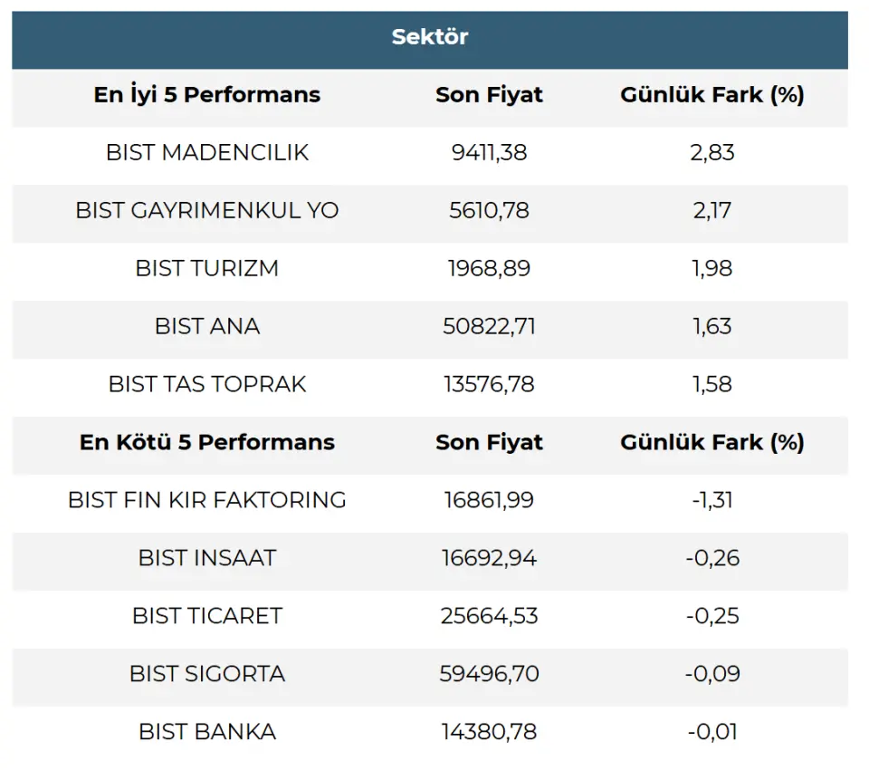 Sektör görünümlerinde ilk yarıda genel olarak pozitif seyrin hakim olduğu görülmektedir. En iyi performans sergileyen(ler) Madencilik, Gayrimenkul Yatırım Ortaklığı ve Turizm olurken baskı görenlerde Finansal Kiralama Faktoring, İnşaat ve Ticaret dikkat çekmektedir.