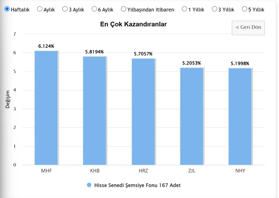 Geçtiğimiz hafta yatırımcılarına en çok kazandıran hisse senedi şemsiye fonu içerisindeki en fazla yükselen fon MHF oldu. Bu fon %6.12'lik bir yükseliş gösterdi. Listenin devam eden sıralarında ise %5.81'lik KHB, %5.7'lik HRZ, %5.2'lik ZJL, %5.2'lik NHY yer alıyor.