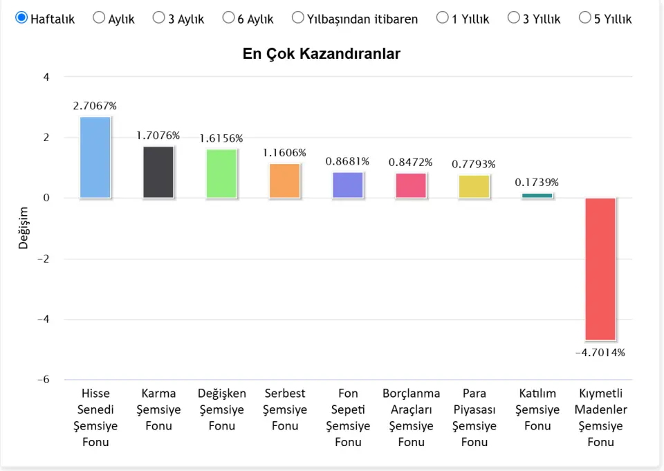 Yatırımcılarına en çok kazandıran şemsiye fonu hisse senedi şemsiye fonu oldu. Son bir haftada hisse senedi şemsiye fonu yatırımcılarına %2.7 oranında para kazandırdı. Listenin ikinci sırasında ise karma şemsiye fonu yer alıyor. Karma şemsiye fonu ise %1.7'lik bir yükseliş gösterdi. Üçüncü sırada ise %1.61'lik bir yükseliş ile değişken şemsiye fonu yer alıyor. Geçtiğimiz haftanın en çok kaybettiren fonu ise kıymetli madenler şemsiye fonu oldu. Kıymetli madenler şemsiye fonu bir haftada %4.7 oranında düşüş gösterdi.