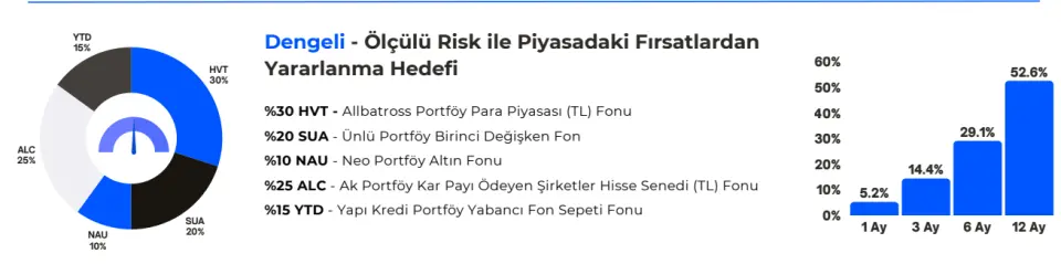 Dengeli portföyümüzdeki fonlardan NAU – Neo Portföy Altın Fonu, altın ve altına dayalı enstrümanlara yatırım yaparak altın fiyatlarından getiri sağlamayı ve BİF’ler ile altın mevduat/katılma hesaplarıyla çeşitlilik sunmayı hedefler. ALC – Ak Portföy Kar Payı Ödeyen Şirketler Hisse Senedi (TL) Fonu, BİST Temettü Endeksi’ndeki yerli paylar ve türev araçlara odaklanır; portföyde yabancı para veya kıymetli maden bulunmaz. YTD – Yapı Kredi Portföy Yabancı Fon Sepeti Fonu ise onaylı yabancı fonlara yatırım yaparak uzun vadeli kazancı maksimize etmeyi ve portföyü çeşitlendirmeyi amaçlar.