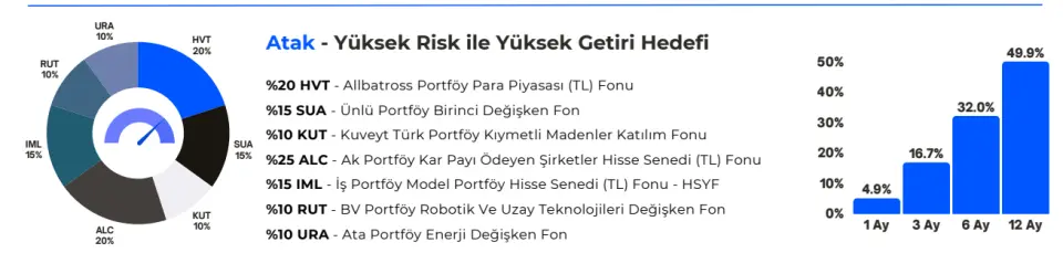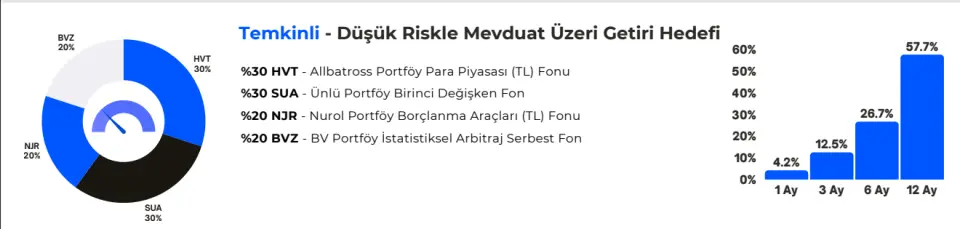 Temkinli portföyümüzde HVT – Allbatross Portföy Para Piyasası (TL) Fonu, kısa vadeli ve likit TL cinsi araçlarla düşük riskli ve düzenli getiri imkânı sunar. SUA – Ünlü Portföy Birinci Değişken Fon, hisse senetleri, sabit getirili enstrümanlar ve emtia benzeri araçlarla Türkiye ekonomisinin uzun vadeli büyüme potansiyelinden yararlanmayı hedefler. NJR – Nurol Portföy Borçlanma Araçları (TL) Fonu, borçlanma araçlarına yatırım yaparak mevduat üzerinde düzenli getiri sağlamayı amaçlar. BVZ – BV Portföy İstatistiksel Arbitraj Serbest Fon ise algoritmik arbitraj stratejileriyle TL cinsi hisse ve türev araçlarda mutlak getiri hedefler.