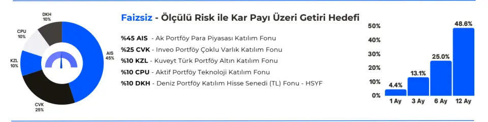 Faizsiz enstrümanlardan oluşan portföyümüzdeki fonlardan AIS - Ak Portföy Para Piyasası Katılım Fonu, kısa vadeli, likiditesi yüksek ve faizsiz/katılım finans ilkelerine uygun enstrümanlara yatırım yapar; portföyde kira sertifikaları, murabaha işlemleri, katılma hesapları ve altın-döviz işlemleri gibi araçlar bulunur. CVK – Inveo Portföy Çoklu Varlık Katılım Fonu ise orta-uzun vadede kar payı endeksinin üzerinde getiri sağlamayı hedefler ve yatırımlarını tamamen uluslararası katılım ilkelerine uygun şekilde yönetir.