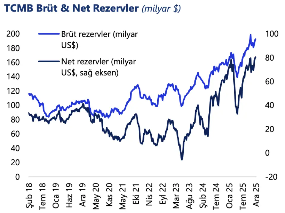 Hisse senedi piyasasında ise aralık ayı başından bu yana kümülatif girişi 500 milyon doları aşmış durumda. 2026 boyunca devam etmesini beklediğimiz faiz indirimleri ve siyasi risk algısındaki kademeli normalleşme çerçevesinde, standart portföy kanallarına yönelik yabancı ilgisinin güçlenebileceğini değerlendiriyoruz. Aynı hafta içerisinde yurt içi yerleşiklerin altın hariç parite etkisinden arındırılmış DTH'ları 139 milyon dolar, altın dahil toplam DTH hesapları ise fiyat etkisinden arındırılmış olarak 479 milyon dolar arttı. 12 - 19 Aralık haftasında TCMB net döviz rezervi 0,8 milyar dolar artışla 80,3 milyar dolara yükselirken, brüt döviz rezervi ise 1,5 milyar dolar artışla 192,4 milyar dolara çıktı ve rekor tazeledi.