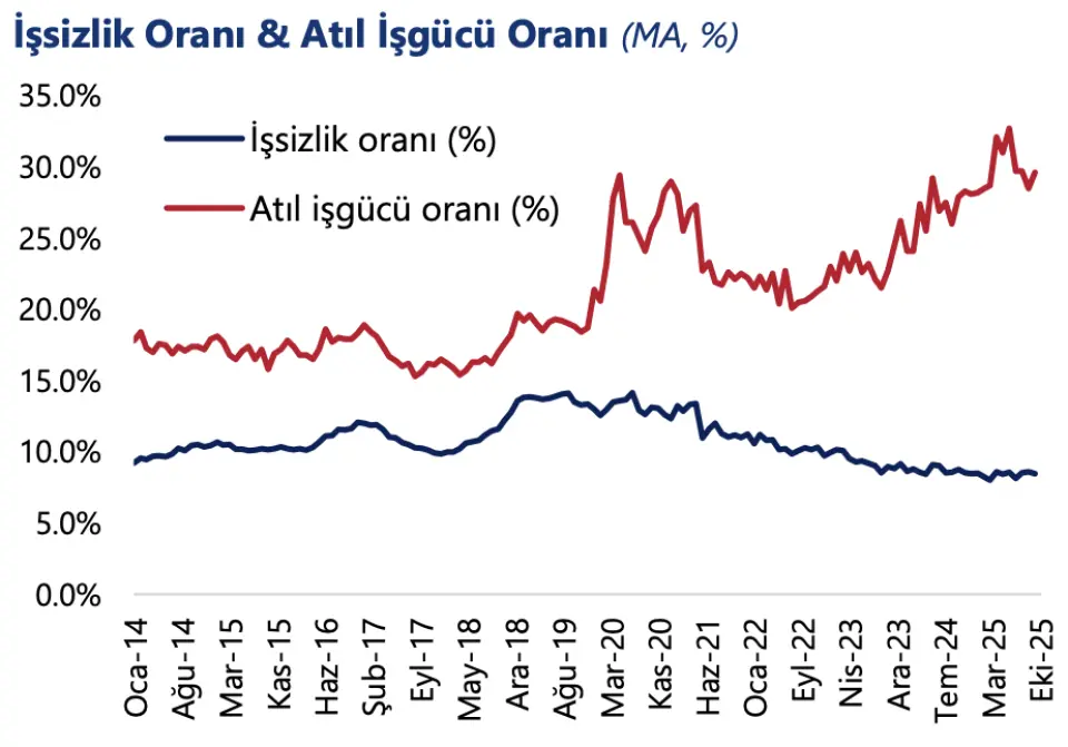 Mevsim etkisinden arındırılmış işsizlik oranı kasım ayında %8,6'dan %8,5'e geriledi. Bu dönemde işgücü 157.000 kişi artarak 35,8 milyona çıkarken, işgücü içerisinde istihdam edilenlerin sayısı ise 185.000 kişi artarak 32,8 milyon oldu. İşsiz kişi sayısı 27.000 kişi düşüşle 3 milyon olurken, İşgücüne katılım oranı ise %53,6'dan %53,8'e çıktı. İşgücü istatistikleri içerisinde yakından izlediğimiz ve daha geniş tanımlı bir işsizlik göstergesi olan âtıl işgücü oranı (zamana bağlı eksik istihdam, potansiyel işgücü ve işsizlerden oluşan geniş tanımlı işsizlik oranı) ise kasım ayında %28,5 seviyesinden %29,6'ya belirgin bir artış gösterdi.