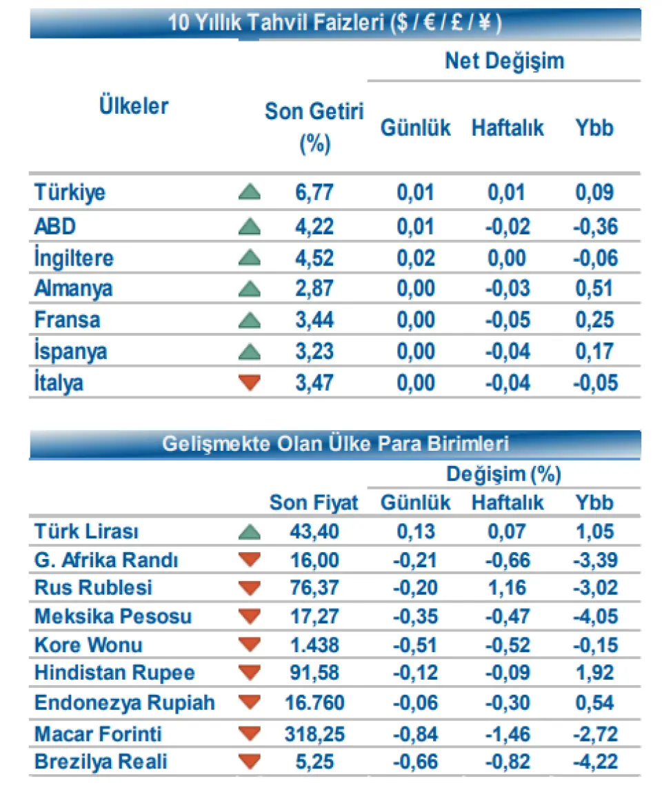 Gün içinde ABD 10 yıllık gösterge tahvil faizi 1 bp artışla %4,22, Almanya 10 yıllık gösterge tahvil faizi %2,87 seviyesinden işlem gördü. Türkiye’nin 5 yıllık Dolar cinsi CDS risk primi 1 bp artışla 213 bp seviyesine yükselirken, Kasım 2036 vadeli 10 yıllık Eurobond faizi 1 bp artışla %6,77 seviyesinden işlem gördü.