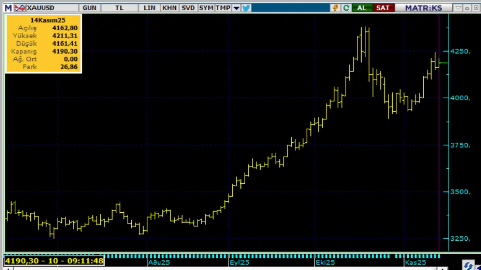 ABD’de hükümet açıldı. Böylece siyasi belirsizlik geri kalmış oldu. Kapalılık hali makro verilerin açıklanmasına engel olmuştu. Verilerin yavaş yavaş gelmesi bekleniyor. ABD-Venezuela hattında gerginlik devam ediyor. Trump’ın masasına bazı planların geldiği ifade ediliyor. Alın 4 bin Usd seviyesindeki dengelenme sonra yükselişe geri döndü. Mevcut seviyelerde biraz yavaşlama olabilir. Son günlerdeki yükselişin tepki olarak kalıp kalmayacağı kritik konu.