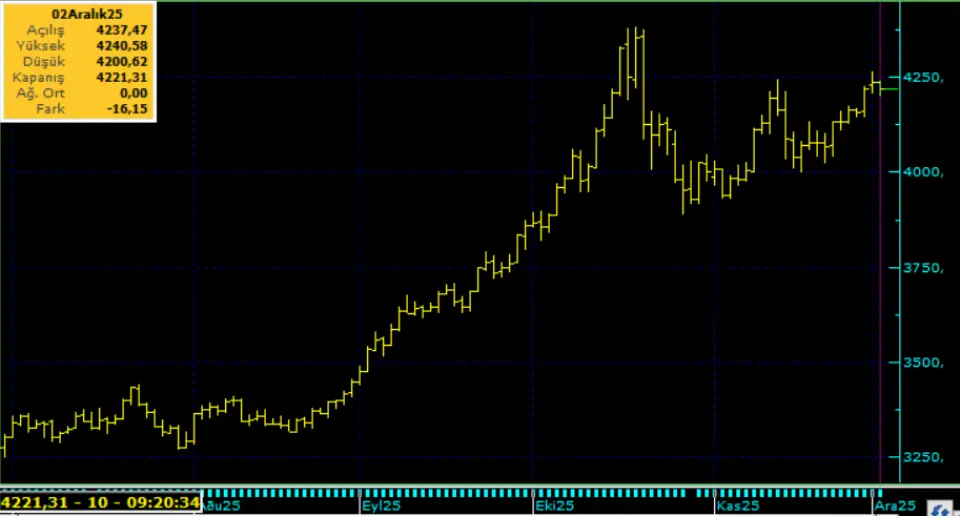 Yukarıda bahsettiğimiz nedenlerden dolayı, altın fiyatlamasında kısa vadede yükseliş arzusu devam edebilir. 4.250 Usd üstünde 4.250-4.380 bant aralığında fiyatlamalara geçiş yapılabilir. Bu sabah 4.225 Usd seviyesindeki ons altında 4.250 ve 4.350 Usd seviyeleri gün içi direnç, 4.200 ve 4,150 Usd seviyeleri gün içi destek seviyeleri olarak izlenebilir. Bugün sınırlı negatif seyir izleyebilir.