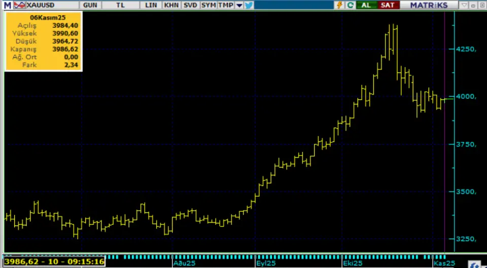 Altın fiyatlarında teknik olarak psikolojik destek noktası 4.000 Usd destek noktası olarak takip edilebilir. 4.000 Usd altında aşağı yönlü denge arayışı devam edebilir. Bu sabah 3.985 Usd seviyesindeki ons altında 4.020 ve 4.050 Usd seviyeleri gün içi direnç, 3.880 ve 3,800 Usd seviyeleri gün içi destek seviyeleri olarak izlenebilir. Bugün yatay sınırlı negatif seyir izleyebilir.