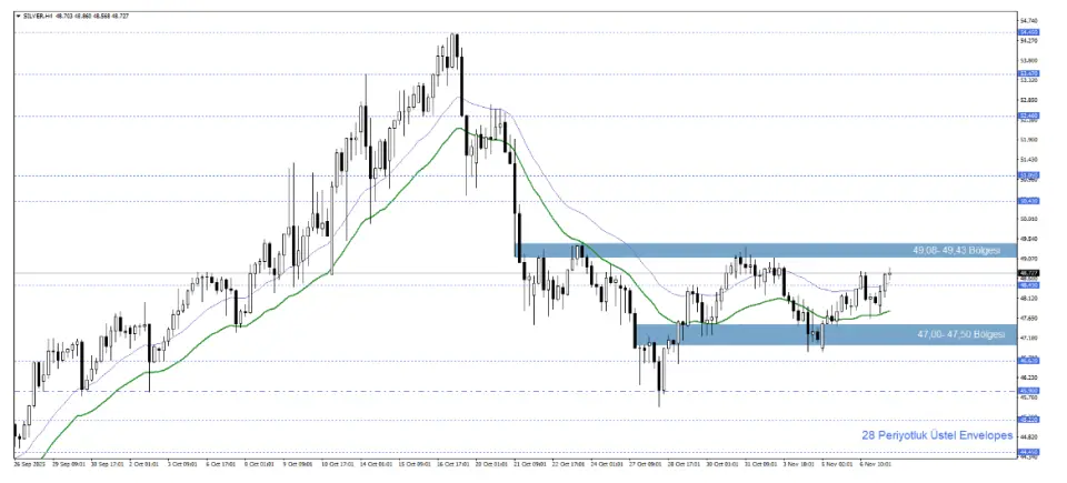 Gümüş fiyatlarında tekrar 40 periyotluk üstel Envelopes göstergesinin üzerinde seyrediyoruz. Ana senaryomuz 49,08- 49,43 bölgesi altında kısa vadeli görünümün negatif seyrini sürdürmesi yönünde. 47,00–47,50 bölgesinin altında gümüş üzerinde baskı güçlenebilir. Bu durumda 45,90 seviyesini takip ediyor olacağız. Alternatif senaryoda ise, 49,08–49,43 bandı üzerinde 4 saatlik kapanış görülmesi durumunda, kısa vadeli görünüm pozitife dönebilir ve 50,43 ile 51,05 seviyeleri gündeme gelebilir.
