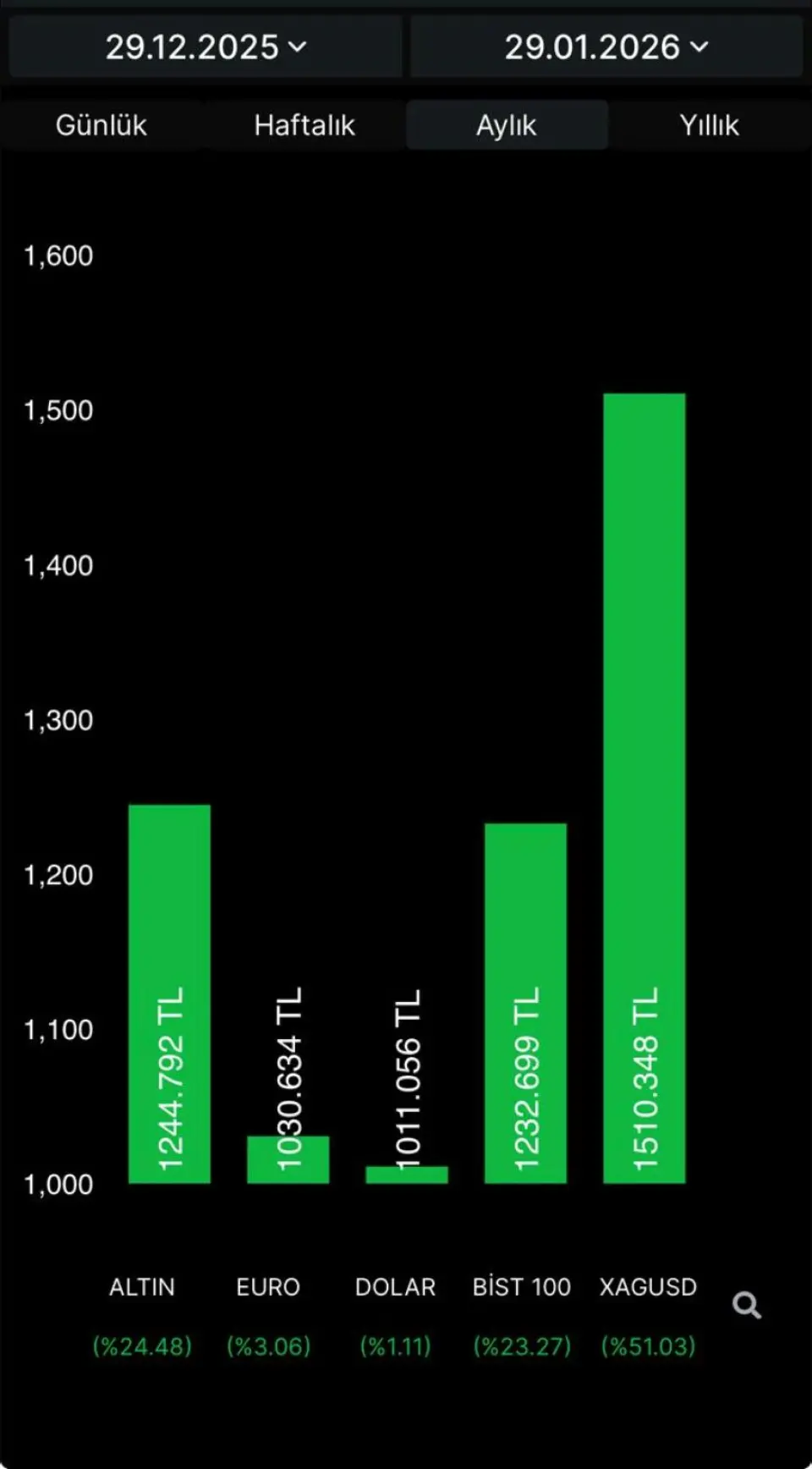Yapılan karşılaştırmada, 1.000 TL ile yapılan yatırımda gümüş (XAGUSD) yatırımcısına yaklaşık %51 getiri sağladı. Bu oran, aynı dönemde altın, döviz ve borsayı açık ara geride bıraktı.