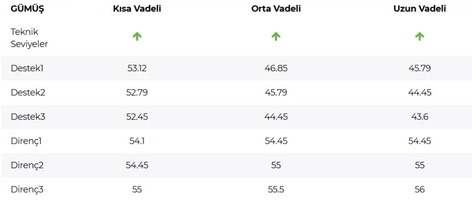 Gümüş fiyatları yükseliş ivmesini koruyor. 54,45 zirvesine yaklaşan fiyatlarda ana senaryomuz, 52,45–52,70 bölgesi ile Envelopes(35) üzerinde kalındığı sürece kısa vadeli pozitif görünümün devam ettiği yönünde. Bu durumda üst sınırı rekor seviye olan 54,10- 54,45 bölgesinden gelen tepkiler izleniyor olacak. Son dönemde trendin oldukça dikleşmesi, kısa vadeli geri çekilme risklerini de artırıyor. Alternatif senaryoda, fiyatların 52,45–52,79 bandının altına sarkması, ana pozitif görünümü tamamen bozmasa da geri çekilmenin derinleşme ihtimalini güçlendirebilir. Bu durumda fiyatların 51,46 seviyesine doğru gevşeme göstermesi mümkün görünüyor.