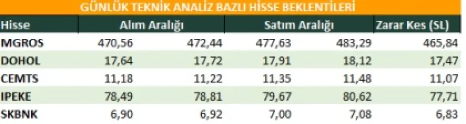 NCM Investment’in yayımladığı günlük rapora göre, küresel ve yurt içi piyasa verileri ışığında teknik anwaliz bazlı hisse beklentileri yatırımcıların dikkatine sunuldu. Raporda, bugün öne çıkması beklenen hisseler MIGROS, DOHOL, CEMTS, IPEKE ve SKBNK olarak belirlendi.
