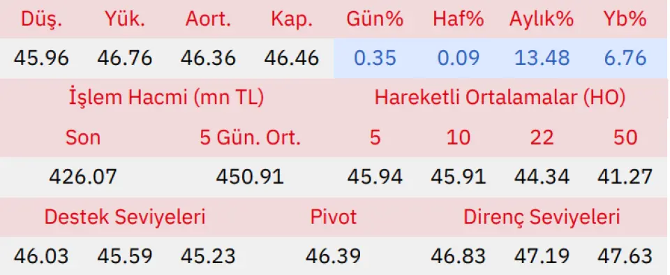 Gün içinde en düşük 45.96 en yüksek 46.76 seviyesini gören Mavi Giyim hissesinin günü %0.35 kazançla tamamladığı gözlenmektedir. Pivot seviye 46.39 seviyesinden geçmekte olup, aşağı yönlü hareketlerde birinci destek 46.03, ikinci destek ise 45.59 seviyesinden geçmektedir. Dirençler ise sırasıyla 46.83, 47.19 seviyelerinden geçmektedir. Bu aşamada endeksin 5 günlük HO seviyesinin %1.13 üstünde, 22 günlük HO seviyesinin ise %4.77 üstünde hareket ettiği dikkat çekmektedir. Son gün işlem hacmi ise bu aşamada 5 günlük ortalama işlem hacminin % 5.51 altında gerçekleşmiştir.