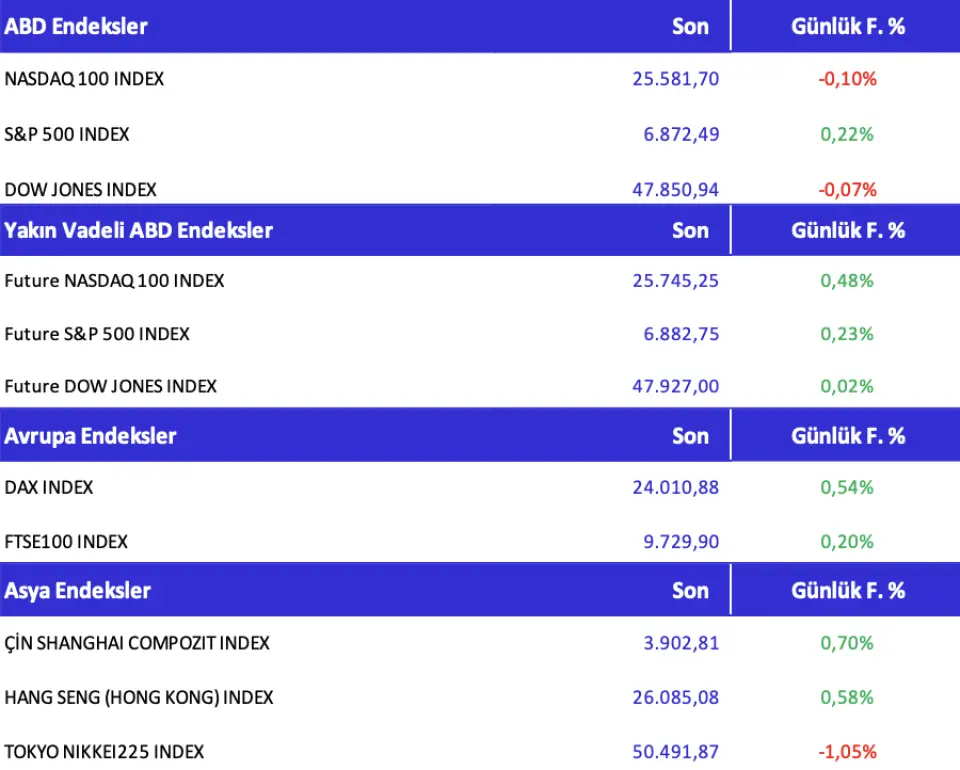 Sanayi, teknoloji ve enerji hisseleri pozitif seyrederken tüketim ve sağlık sektörleri baskı altında kaldı. Sanayide Caterpillar ve GE Vernova güçlü performans gösterirken savunma hisseleri de yükseldi. Teknolojide Nvidia, Oracle ve Salesforce yükselişe öncülük ederken Intel ve Micron zayıf kaldı. Enerjide petrol fiyatlarındaki artış SLB, Halliburton ve Williams Cos'u destekledi. Tüketim tarafında Costco ve Kroger düşerken Dollar General sert yükseldi. Otomotiv hisseleri Tesla ve GM ile güçlenirken, ev inşaat şirketleri geriledi. Sağlıkta Lilly ve J&J düşerken CVS ve Edwards sınırlı yükselişler kaydetti.