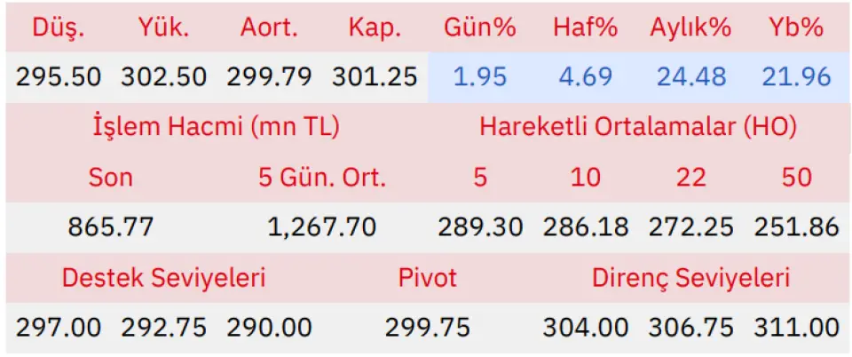 Gün içinde en düşük 295.50 en yüksek 302.50 seviyesini gören Tofaş Türk Otomobil Fabrikası hissesinin günü %1.95 kazançla tamamladığı gözlenmektedir. Pivot seviye 299.75 seviyesinden geçmekte olup, aşağı yönlü hareketlerde birinci destek 297.00, ikinci destek ise 292.75 seviyesinden geçmektedir. Dirençler ise sırasıyla 304.00, 306.75 seviyelerinden geçmektedir. Bu aşamada endeksin 5 günlük HO seviyesinin %4.13 üstünde, 22 günlük HO seviyesinin ise %10.65 üstünde hareket ettiği dikkat çekmektedir. Son gün işlem hacmi ise bu aşamada 5 günlük ortalama işlem hacminin % 31.71 altında gerçekleşmiştir.