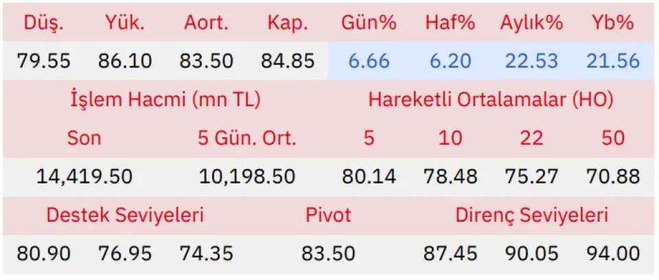 Gün içinde en düşük 79.55 en yüksek 86.10 seviyesini gören Akbank hissesinin günü %6.66 kazançla tamamladığı gözlenmektedir. Pivot seviye 83.50 seviyesinden geçmekte olup, aşağı yönlü hareketlerde birinci destek 80.90, ikinci destek ise 76.95 seviyesinden geçmektedir. Dirençler ise sırasıyla 87.45, 90.05 seviyelerinden geçmektedir. Bu aşamada endeksin 5 günlük HO seviyesinin %5.88 üstünde, 22 günlük HO seviyesinin ise %12.73 üstünde hareket ettiği dikkat çekmektedir. Son gün işlem hacmi ise bu aşamada 5 günlük ortalama işlem hacminin % 41.39 üstünde gerçekleşmiştir.