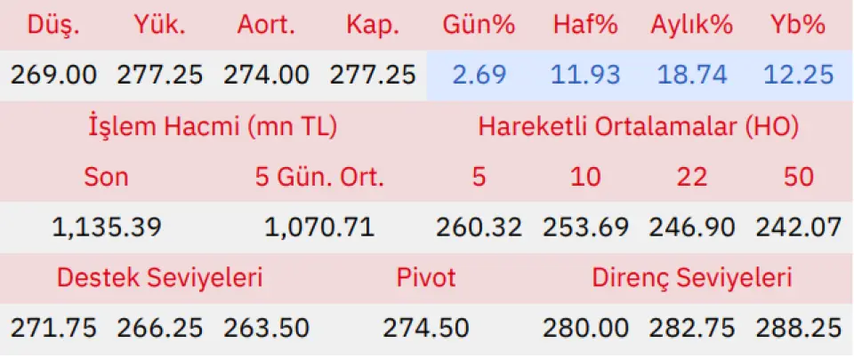 Gün içinde en düşük 269.00 en yüksek 277.25 seviyesini gören Tofaş Türk Otomobil Fabrikası hissesinin günü %2.69 kazançla tamamladığı gözlenmektedir. Pivot seviye 274.50 seviyesinden geçmekte olup, aşağı yönlü hareketlerde birinci destek 271.75, ikinci destek ise 266.25 seviyesinden geçmektedir. Dirençler ise sırasıyla 280.00, 282.75 seviyelerinden geçmektedir. Bu aşamada endeksin 5 günlük HO seviyesinin %6.50 üstünde, 22 günlük HO seviyesinin ise %12.29 üstünde hareket ettiği dikkat çekmektedir. Son gün işlem hacmi ise bu aşamada 5 günlük ortalama işlem hacminin % 6.04 üstünde gerçekleşmiştir.