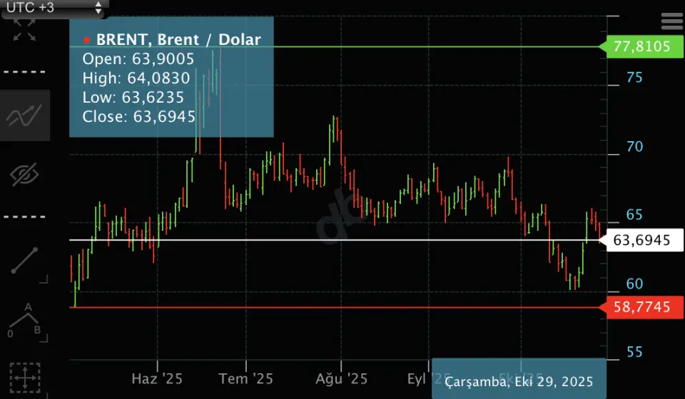 Brent petrol yeni haftada aşağı yönlü baskılar almaya devam ediyor. Geçtiğimiz gün 64.83 desteğini aşağı yönlü kırmaya zorlayan brent petrol, bugün bu desteğin altında inerek 63.50 seviyesine kadar geriledi.