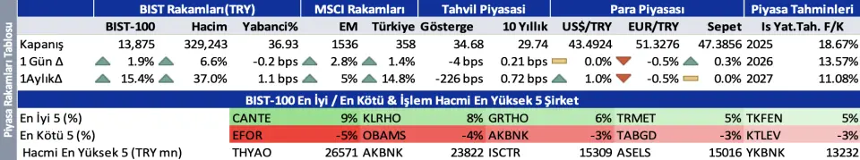 ABD ve Asya piyasalarının seyri Borsa İstanbul’da satıcılı bir açılışa işaret ediyor. Ancak negatif enflasyon şokuna rağmen endeksin yükselmesi, Aselsan Türk Altın gibi yükselişte öncü olan hisselerdeki kaybın zorlanmadan dengelenmesi Borsa İstanbul’un dünyadan bağımsız yükselme eğiliminde olduğunu gösteriyor. Akşam vadelinin seyri küresel satış nedeniyle endeksteki kaybın sınırlı olacağını söylüyor. Endeks için destek ve direnç seviyeleri 13.800 ve 14.000.
